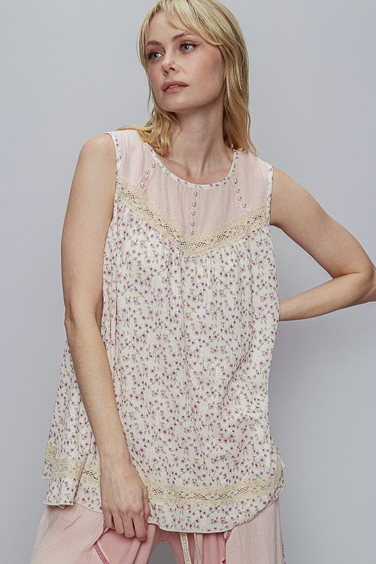 POL Lace Detail Floral Round Neck Sleeveless Top
