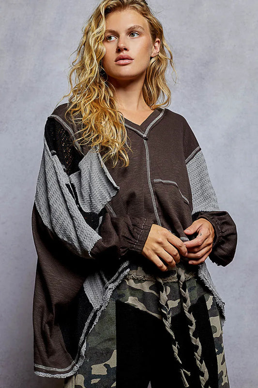 POL High-Low Hem Contrast Stitching V-Neck Top