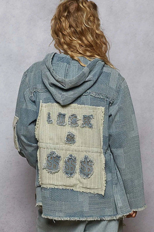 POL Raw Hem Zip Up Denim Jacket with Plaid and Crochet Patch