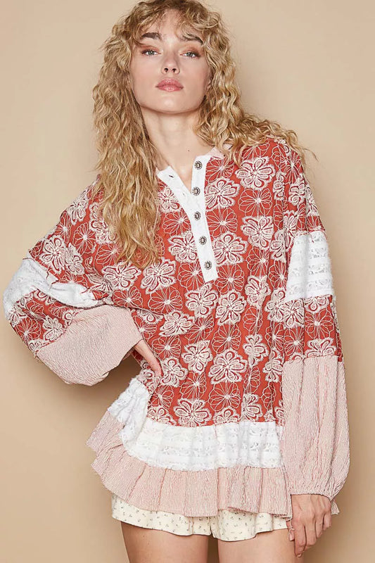 POL Thermal and Crochet Lace Mix Shirt with Floral Pattern