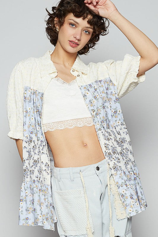 POL Ruffled Hem Floral Button Up Half Sleeve Shirt