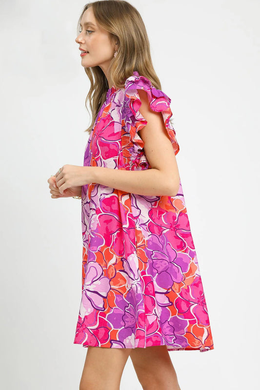 Umgee Floral Print Ruffle Sleeve Mini Dress