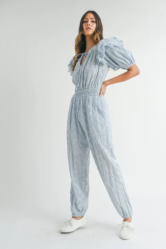 MABLE Eyelet Lace Ruffle Shoulder Jumpsuit